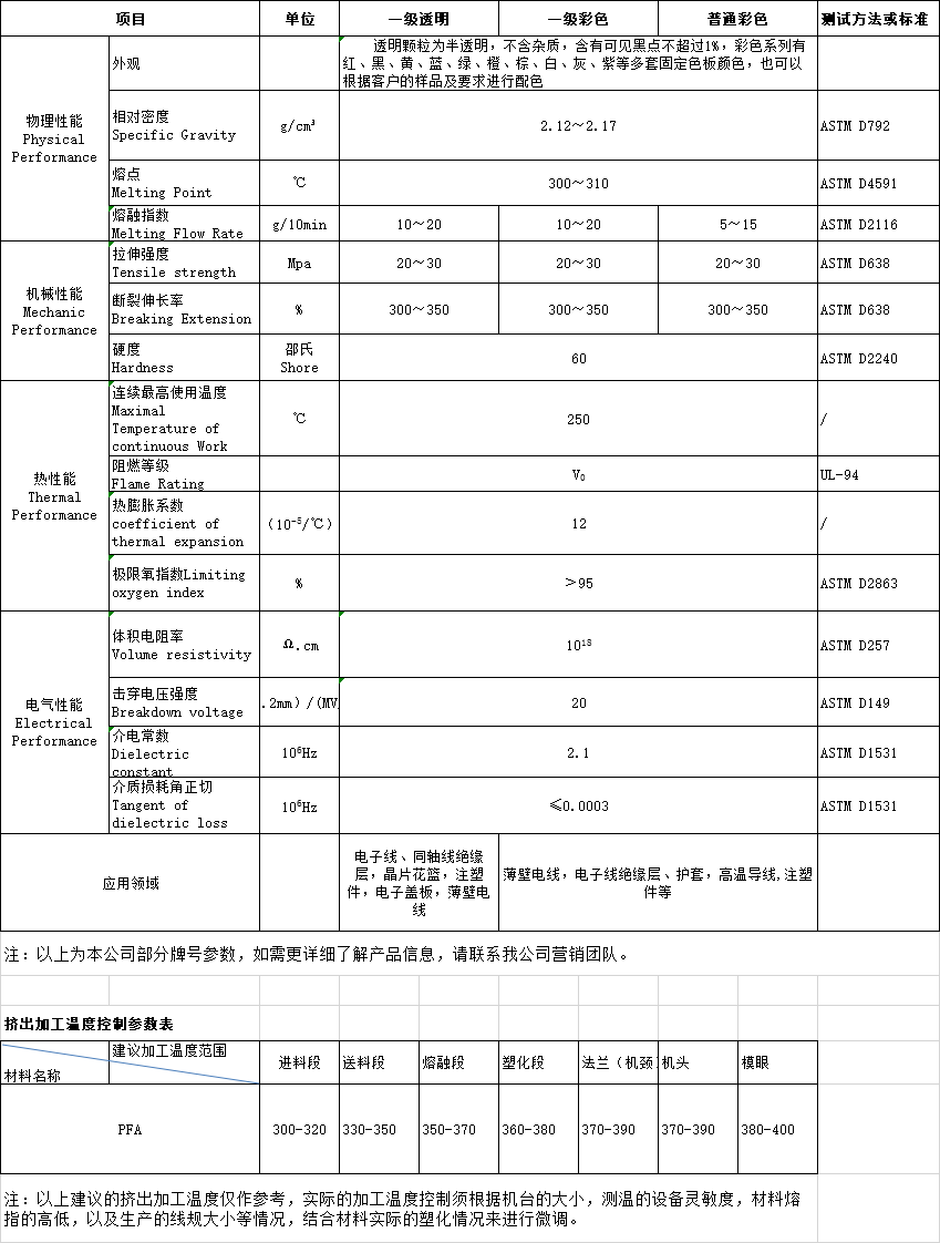 PFA has excellent chemical stability, physical and mechanical properties, electrical insulation, lubricity, non stickiness, aging resistance and non flammability, which are similar to those of PCE. It also has the same thermal stability as poly (tetrachloroethylene), long-term service temperature is - 250 ~ 250 ℃, thermal decomposition temperature is above 450 ℃, even in 285 ℃ air can still be stable for 2000 H. Its outstanding feature is good thermoplasticity. Its high-temperature mechanical strength is about 2 times higher than that of ordinary polytetrafluoroethylene. For example, at 250 ℃, the tensile strength of ordinary polytetrafluoroethylene is only 4.9 MPa, while that of fusible polytetrafluoroethylene is 13.72 MPa, which is 1 / 2-1 / 3 of room temperature.